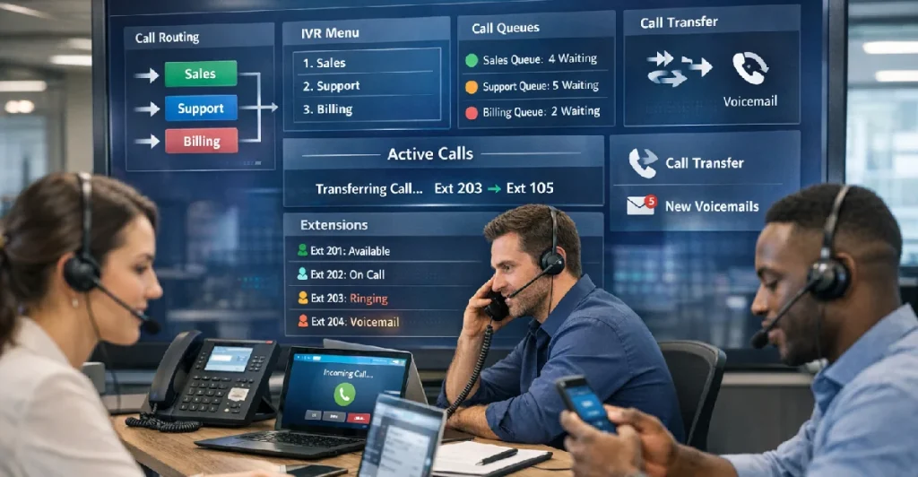 Internally, employees dial short extension numbers. Externally, callers reach the company through a handful of shared phone lines. The PBX manages everything in between routing, transferring, queuing, recording, and reporting.
